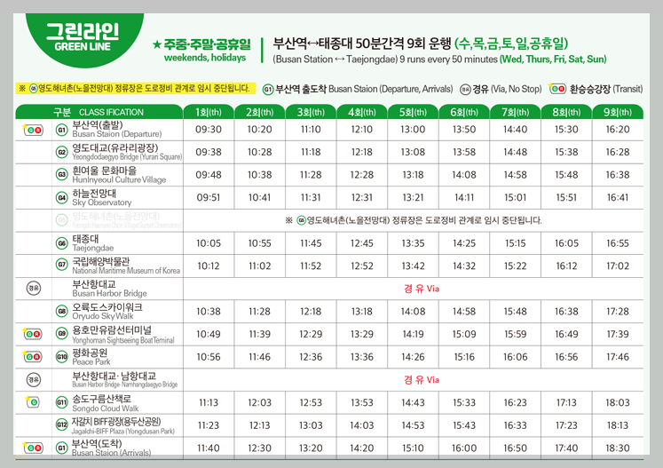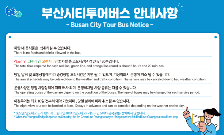- 이용권을 구매하지 못했을 경우 부산시티투어버스 기사님께 직접 결제후 탑승도 가능합니다.(선착순)